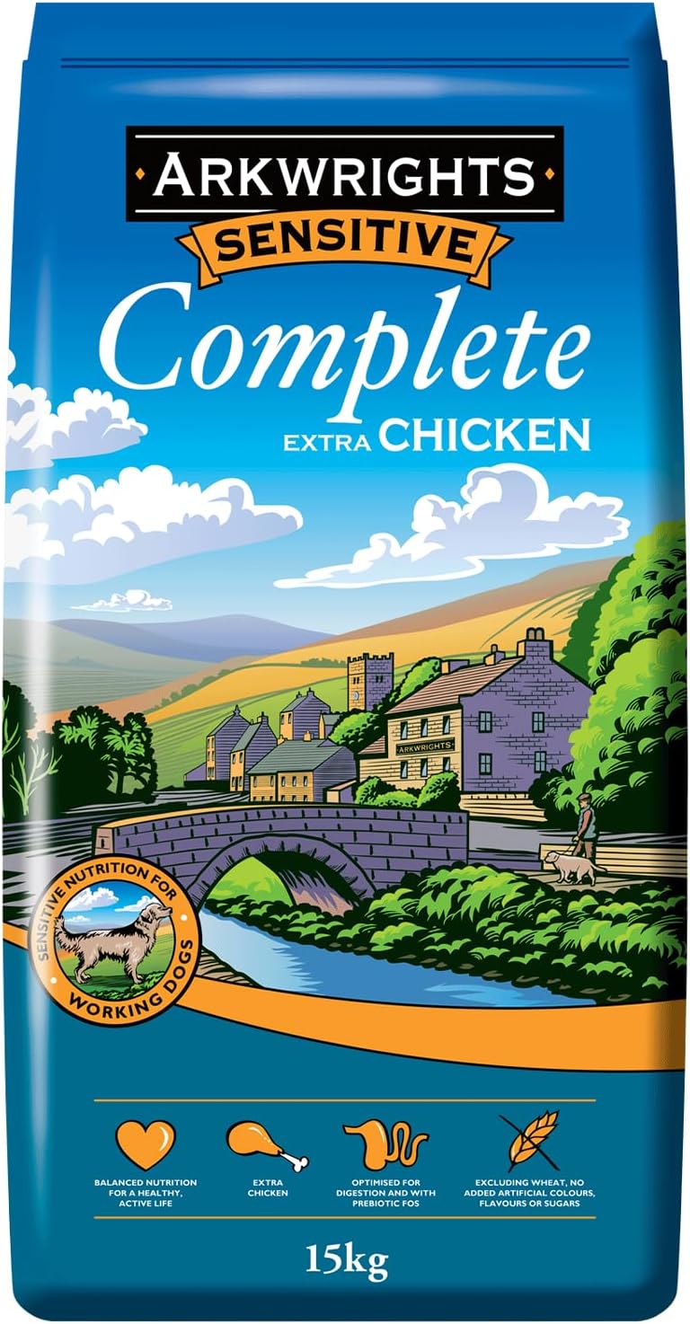 - TASTY EXTRA CHICKEN DRY FOOD — Arkwrights Sensitive Complete Extra Chicken provides a balanced wheat, dairy and soy-free dry dog food recipe. Ideal for adult dogs with sensitive stomachs or those who have difficulty digesting wheat